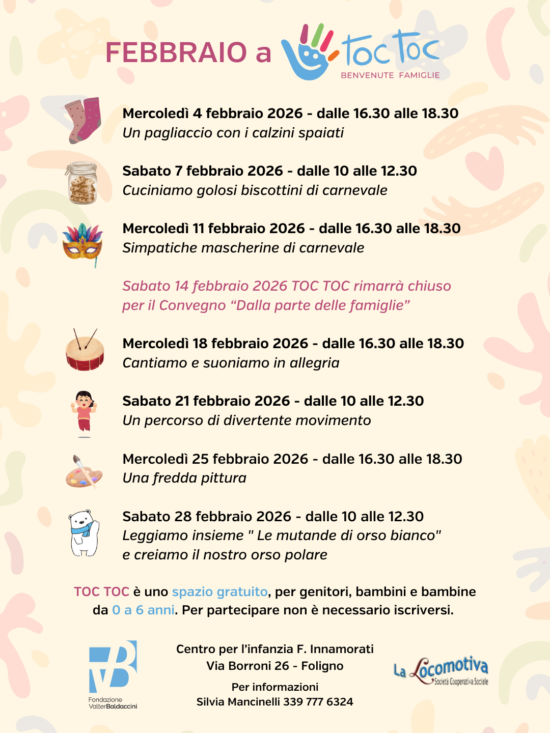 A febbraio nello spazio TOC TOC benvenute famiglie si respira aria di Carnevale. Le educatrici della cooperativa la Locomotiva hanno organizzato, come ogni mese, delle attività educative gratuite pensate per far trascorrere a tante mamme e papà tempo di qualità con i propri figli.