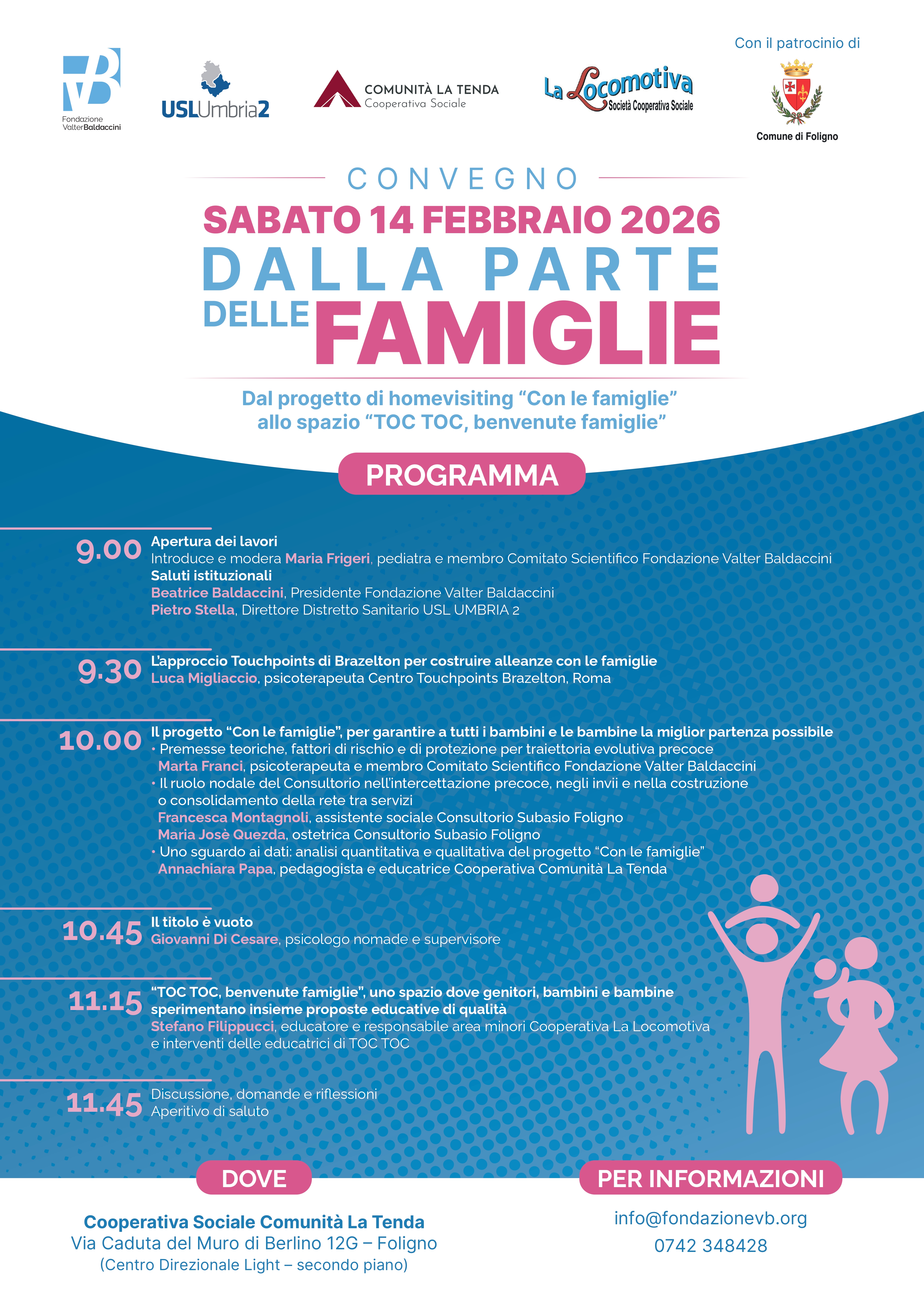 La Fondazione Valter Baldaccini promuove il convegno Dalla parte delle famiglie. Dal progetto di homevisiting “Con le famiglie” allo spazio “TOC TOC, benvenute famiglie” un appuntamento pensato per raccontare due importanti progetti sociali di sostegno alla genitorialità e contrasto alla povertà educativa della Fondazione Valter Baldaccini, attivi nel territorio di Foligno, grazie a un importante e fondamentale lavoro di rete tra realtà del pubblico e privato.